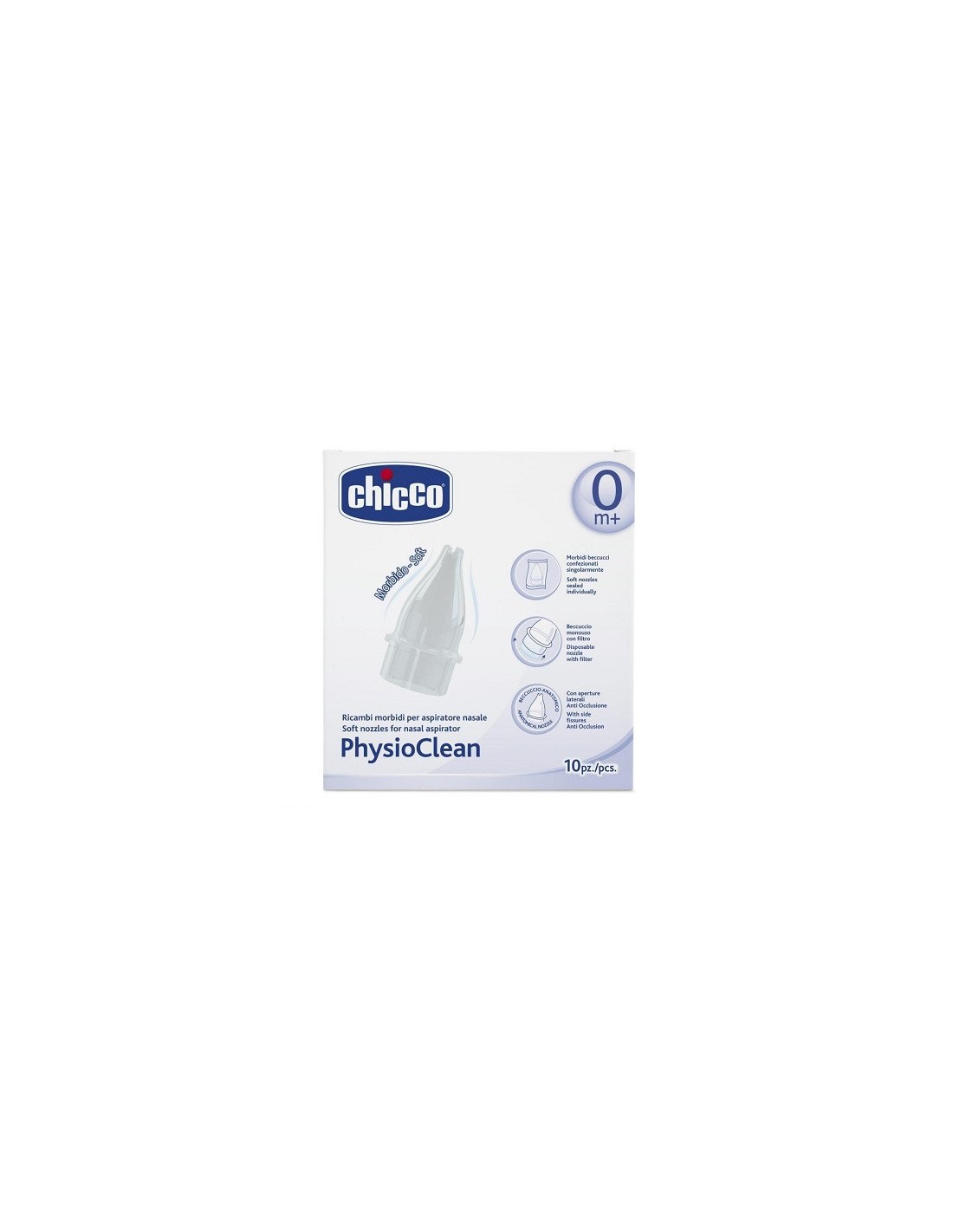 L’aspiratore nasale PhysioClean di Chicco permette l’eliminazione dellesecrezioni nasali in eccesso, che possono impedire al bambino di respirare bene, in modopratico e delicato. La forma ergonomica agevola la mamma durante l’utilizzo e ilbeccuccio morbido è particolarmente indicato per il nasino sensibile e delicatodei più piccoli. I beccucci monouso, con filtro già inserito, garantisconola massima igiene. Va utilizzato ogni volta che le narici del bambino sono occluse,più volte nella giornata, in modo da mantenerle sempre libere. È buonaregola praticare l’aspirazione nasale subito dopo aver instillato la soluzionefisiologica PhysioClean, dalle proprietà idratanti della mucosa nasale, azione chefavorisce la rimozione delle secrezioni nasali in eccesso.