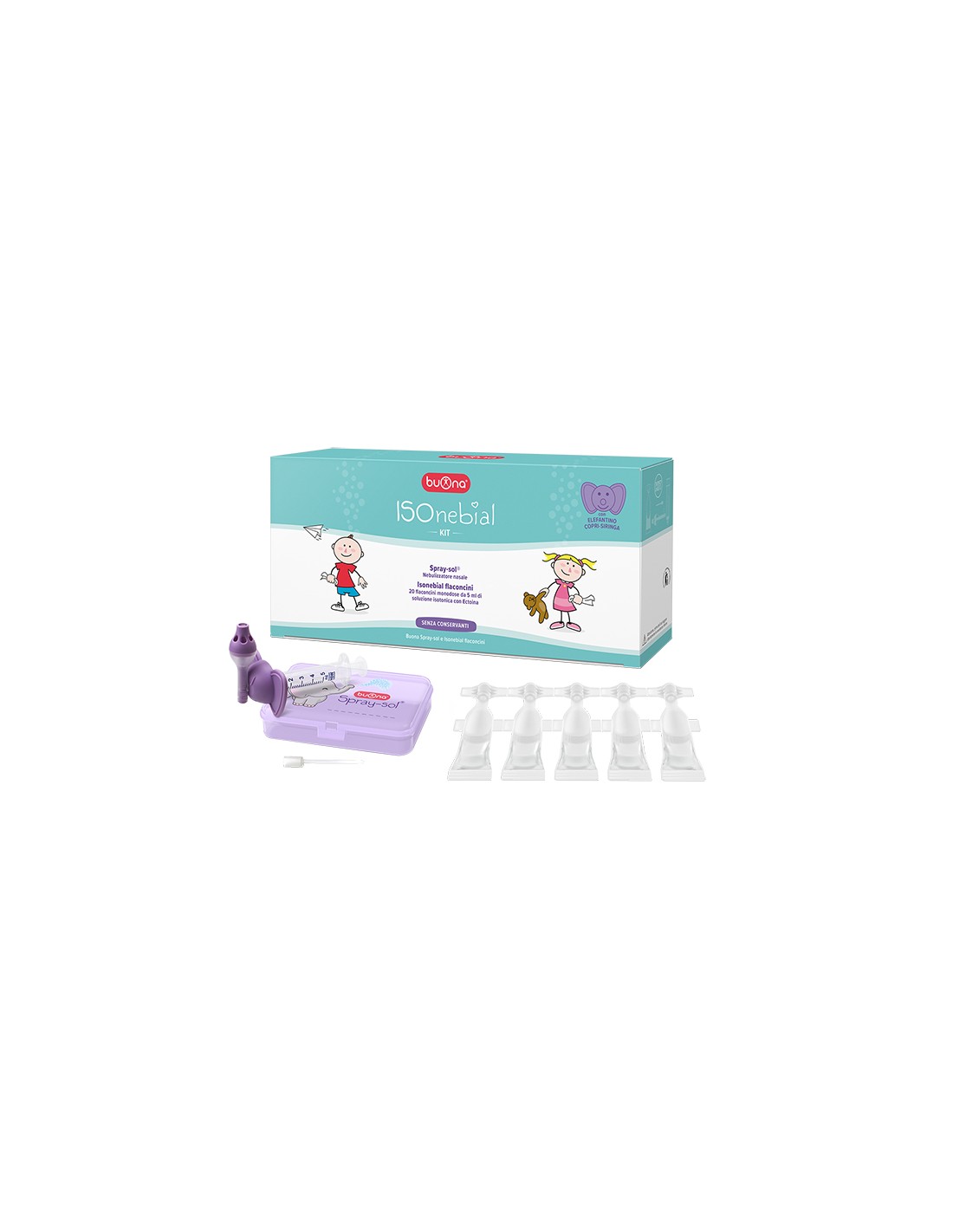 Kit contenente 4 dispositivi medici recanti la marcatura CE (Isonebial flaconcini,Spray-sol, ago cannula e siringa Luer-Lock). La soluzione isotonica allo 0,9%, conaggiunta di ectoina contenuta nei flaconcini di Isonebial è utile per la puliziaquotidiana delle cavità nasali, in particolare in caso di naso chiuso o secco.Ammorbidisce il muco favorendone l’eliminazione e ristabilisce un giusto grado diidratazione delle mucose nasali secche o incrostate, migliorando la respirazione.L’ectoina contenuta in Isonebial, grazie alla sua elevata capacità di legaremolecole d’acqua, ha un effetto protettivo e un’azione idratante che donasollievo alla mucosa irritata. Isonebial kit permette la nebulizzazione della soluzionesalina isotonica allo 0,9% mediante il dispositivo medico Spray-sol (brevetto in licenzaesclusiva Steve Jones srl).