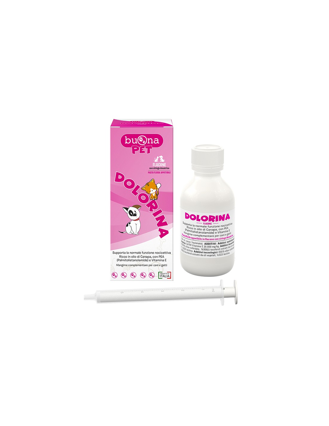 Mangime complementare per cani e gatti formulato in pasta fluida appetibile con olio dicanapa, PEA (palmitoiletanolamide) e vitamina E per favorire la normale funzione delsistema nocicettivo dell’animale.
