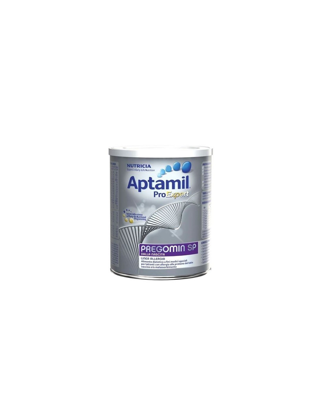 Aptamil ProExpert PregominSP è un alimento dietetico a fini medici speciali indicato per la gestionedietetica dell'allergia alle proteine del latte vaccino e/o malassorbimento. AptamilPregomin SP è un idrolizzato estensivo di sieroproteine, a base di peptidi acatena corta, amminoacidi liberi e lipidi costituiti al 46% da TMC (trigliceridi a mediacatena) ed arricchito con LC-PUFA e nucleotidi.