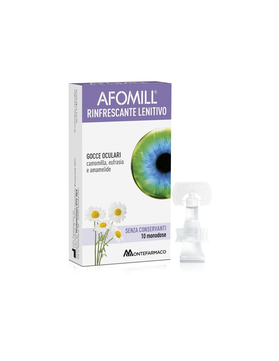 Soluzione sterile ad usooftalmico senza conservanti, a pH fisiologico, a base di acque distillate di camomilla,amamelide ed eufrasia, indicata per alleviare la stanchezza e lo stress oculare causatida agenti atmosferici, fattori ambientali, stili di vita e dall’uso prolungato dilenti a contatto. Afomill Rinfrescante Lenitivo può essere utilizzato in presenzadi lenti a contatto.